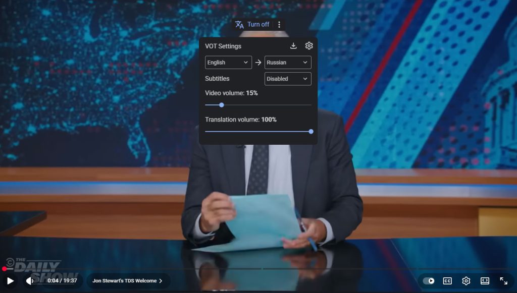 Тепер The Daily Show (і будь-яке інше відео на YouTube) можна слухати з голосовим перекладом, хоч і російською мовою. Працює дуже круто і природно.